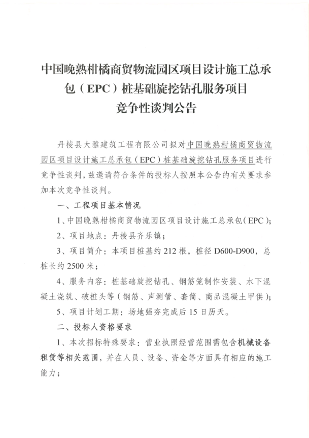 【大雅建筑公司】中國晚熟柑橘商貿物流園區(qū)項目設計施工總承包(EPC)樁基礎旋挖鉆孔服務項目競爭性談判公告