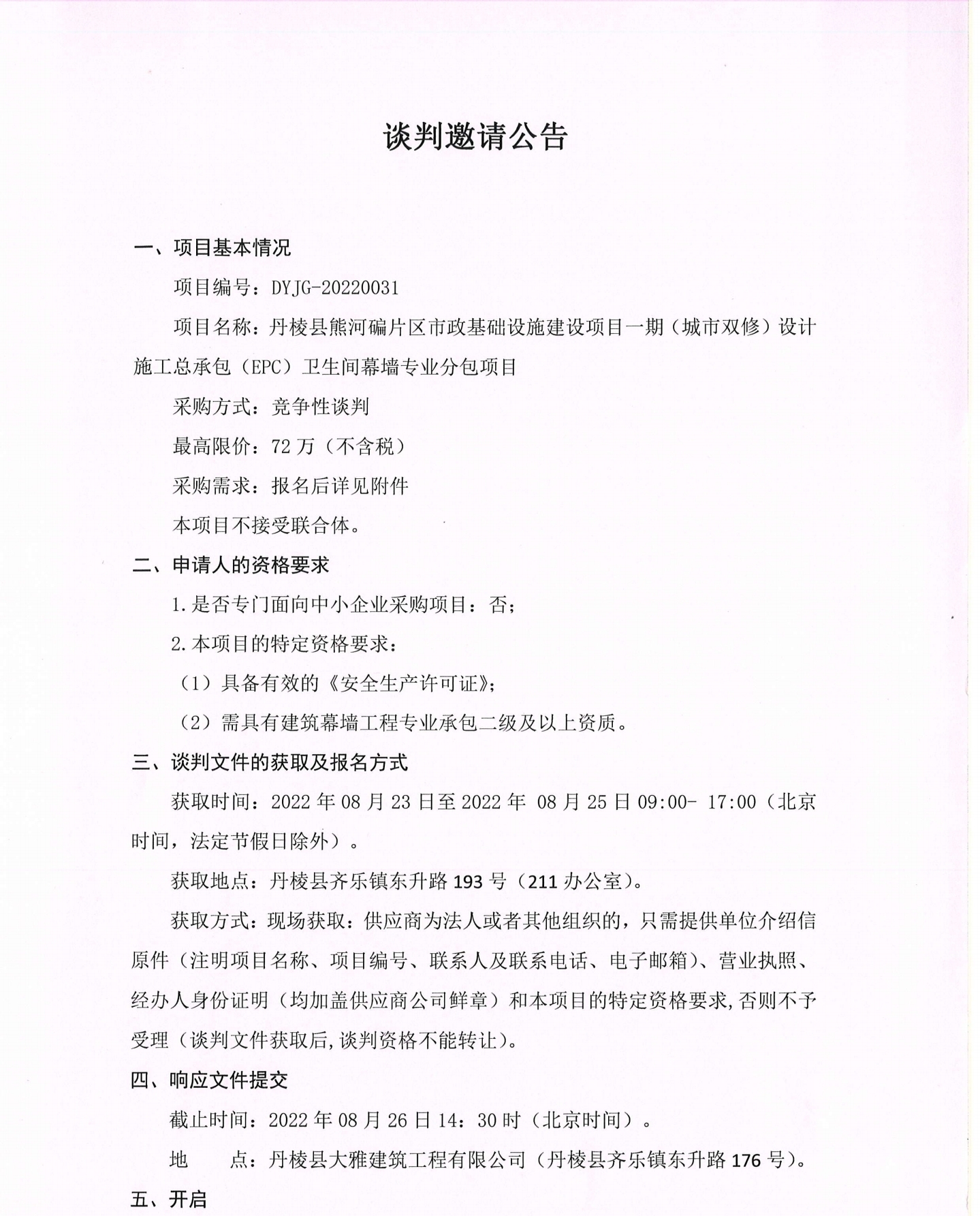 丹棱縣熊河碥片區(qū)市政基礎(chǔ)設(shè)施建設(shè)項(xiàng)目一期(城市雙修)設(shè)計(jì)施工總承包(EPC)衛(wèi)生間幕墻專業(yè)分包項(xiàng)目談判邀請(qǐng)公告