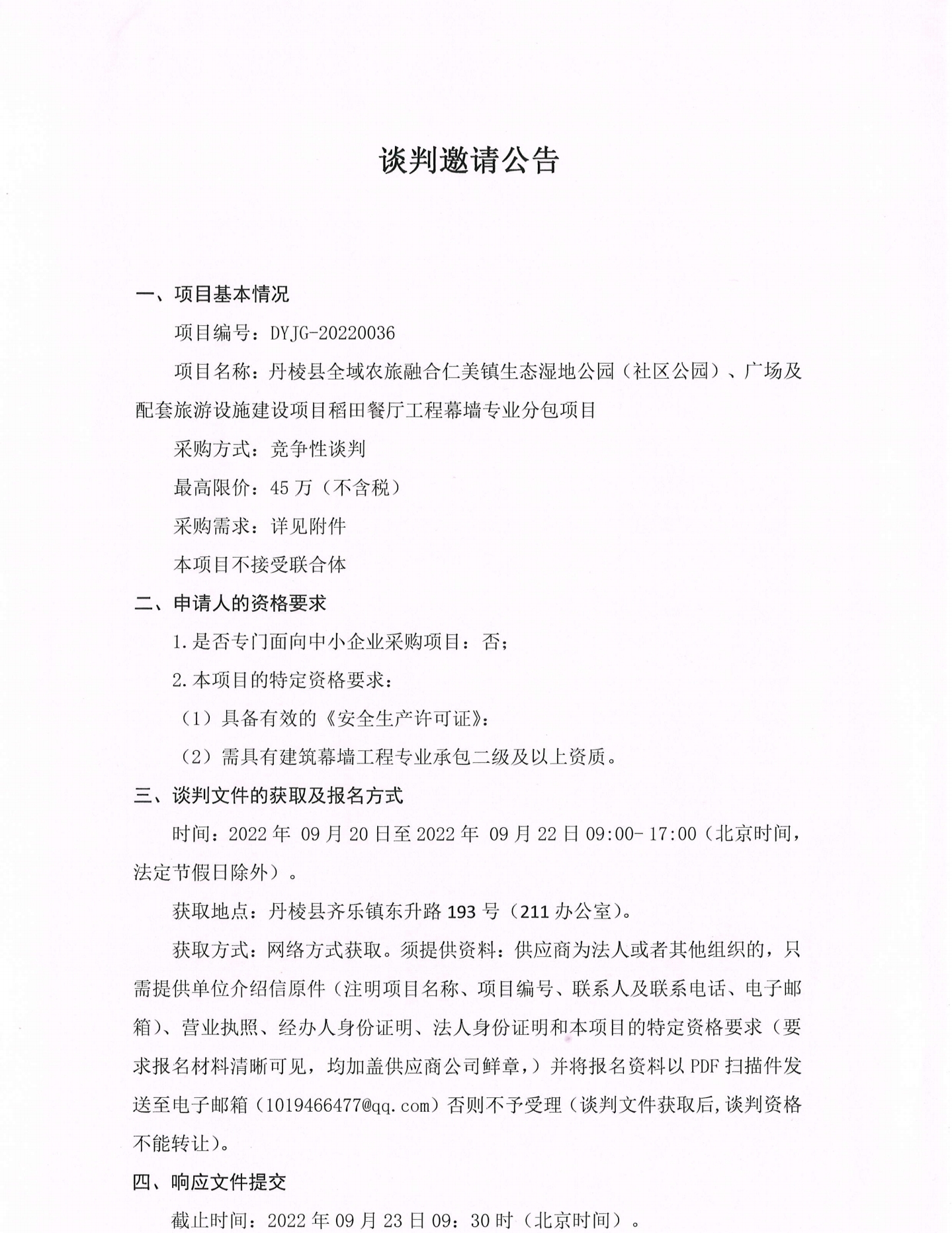 丹棱縣全域農(nóng)旅融合仁美鎮(zhèn)生態(tài)濕地公園(社區(qū)公園)、廣場(chǎng)及配套旅游設(shè)施建設(shè)項(xiàng)目稻田餐廳工程幕墻專業(yè)分包項(xiàng)目談判邀請(qǐng)公告