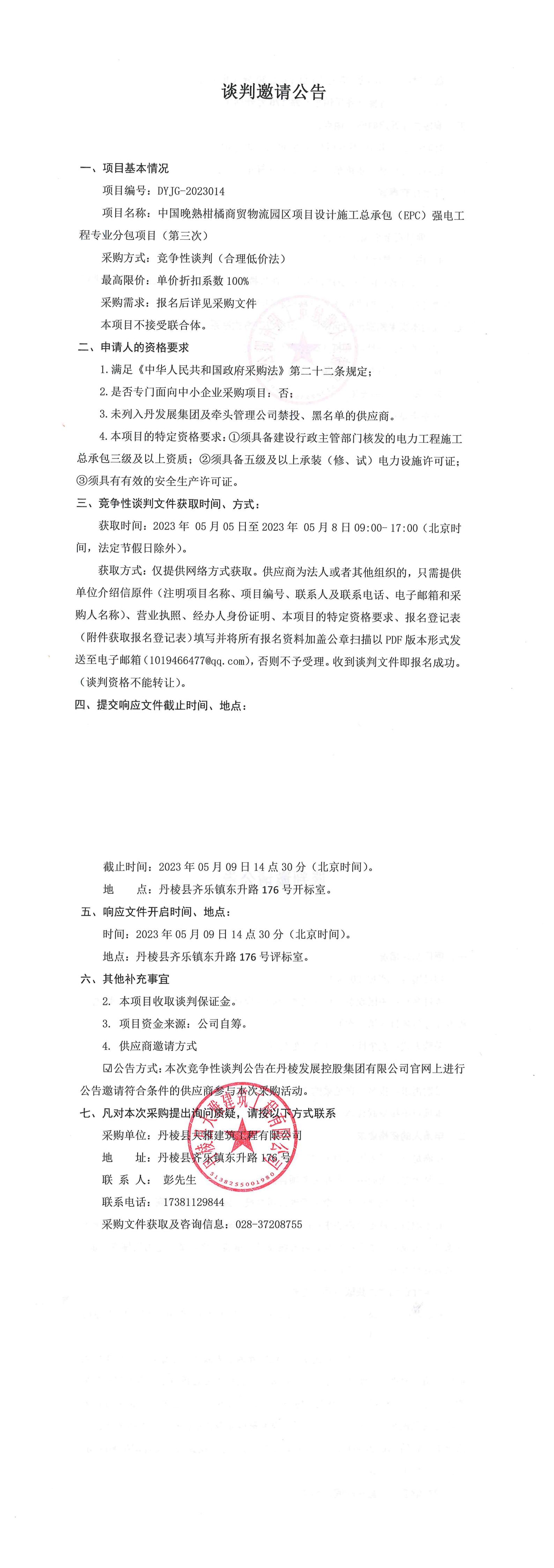 中國晚熟柑橘商貿(mào)物流園區(qū)項(xiàng)目設(shè)計(jì)施工總承包(EPC)強(qiáng)電工程專業(yè)分包項(xiàng)目(第三次)談判邀請(qǐng)公告