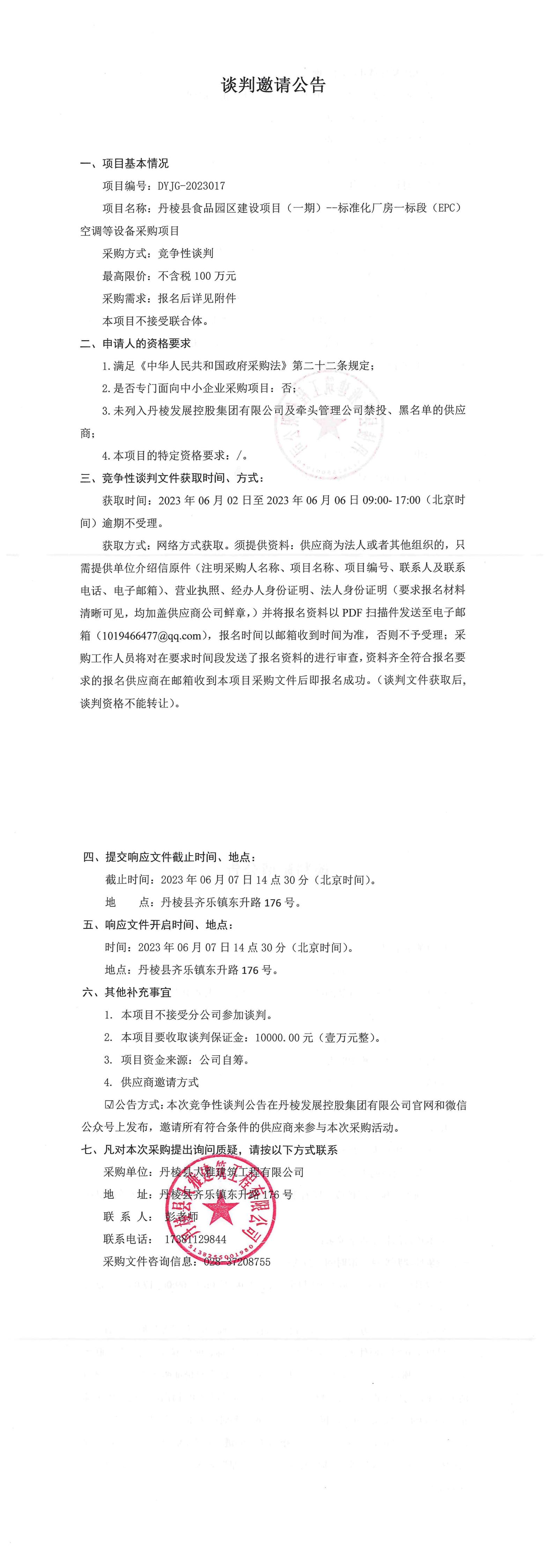 丹棱縣食品園區(qū)建設項目(一期)--標準化廠房一標段(EPC)空調(diào)等設備采購項目談判邀請公告