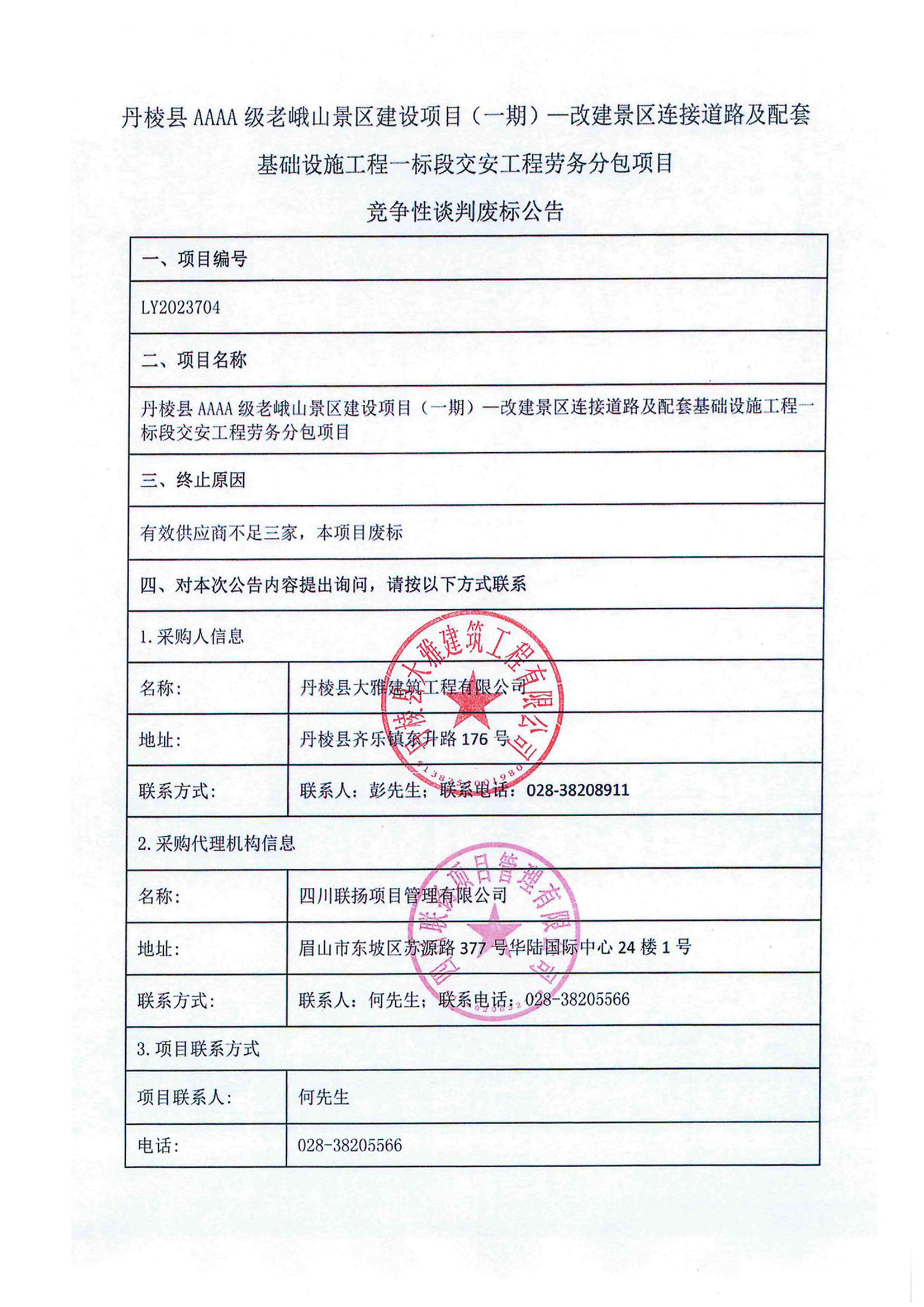 丹棱縣AAAA級(jí)老峨山景區(qū)建設(shè)項(xiàng)目(一期)一改建景區(qū)連接道路及配套基礎(chǔ)設(shè)施工程一標(biāo)段交安工程勞務(wù)分包項(xiàng)目競(jìng)爭(zhēng)性談判廢標(biāo)公告