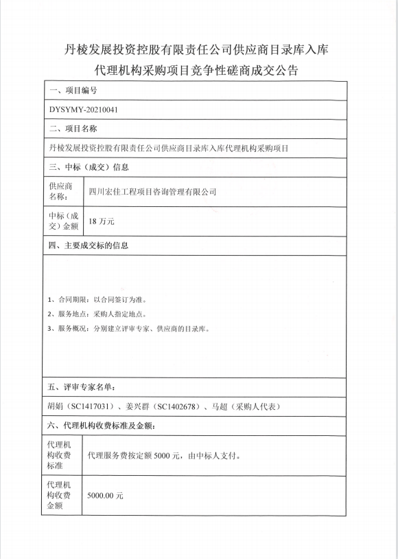 【丹發(fā)展公司】丹棱發(fā)展投資控股有限責(zé)任公司供應(yīng)商目錄庫(kù)入庫(kù)代理機(jī)構(gòu)采購(gòu)項(xiàng)目競(jìng)爭(zhēng)性磋商成交公告