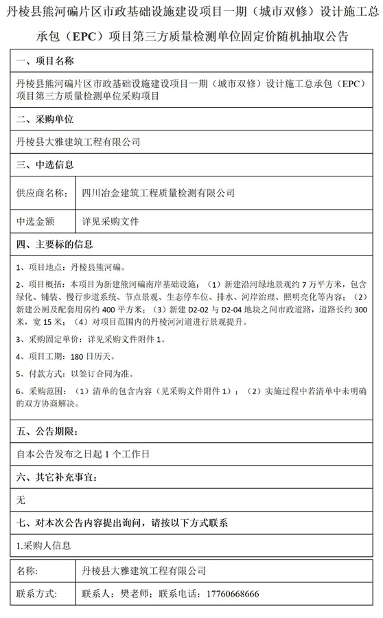 丹棱縣熊河碥片區(qū)市政基礎設施建設項目一期(城市雙修)設計施工總承包(EPC)項目第三方質量檢測單位固定價隨機抽取公告