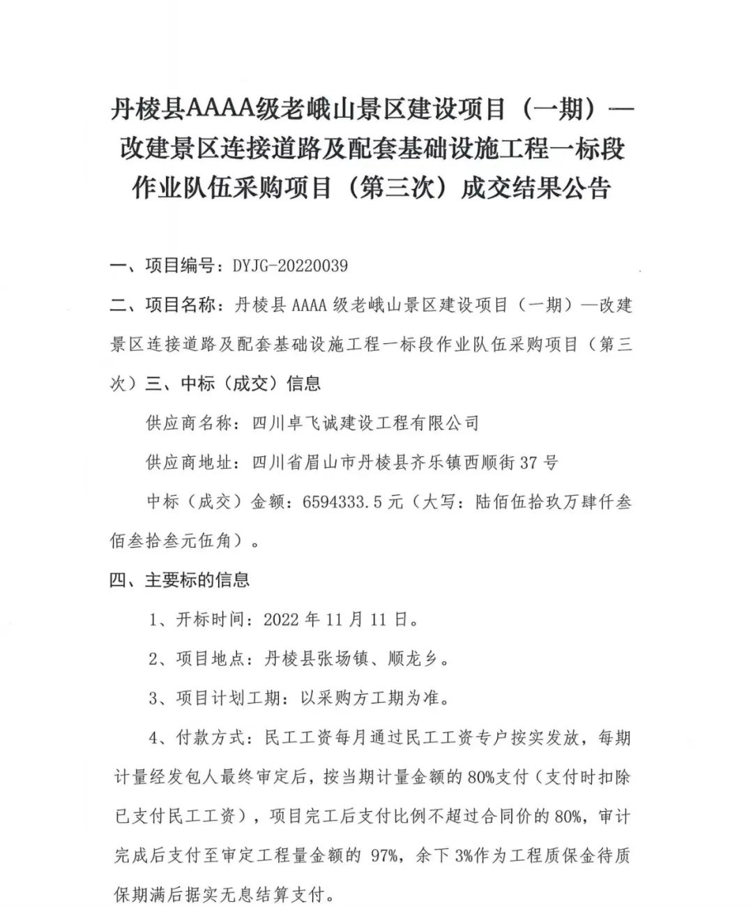 丹棱縣AAAA級老峨山景區(qū)建設(shè)項目 (一期)-改建景區(qū)連接道路及配套基礎(chǔ)設(shè)施工程一標段作業(yè)隊伍采購項目 (第三次) 成交結(jié)果公告