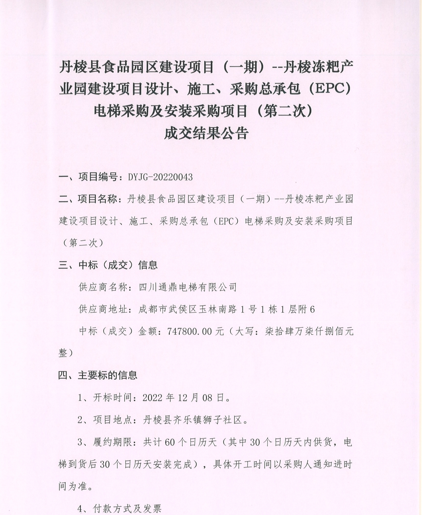 丹梭縣食品園區(qū)建設(shè)項(xiàng)目 (一期) --丹棱凍粑產(chǎn)業(yè)園建設(shè)項(xiàng)目設(shè)計(jì)、施工、采購(gòu)總承包 (EPC)電梯采購(gòu)及安裝采購(gòu)項(xiàng)目 (第二次)成交結(jié)果公告
