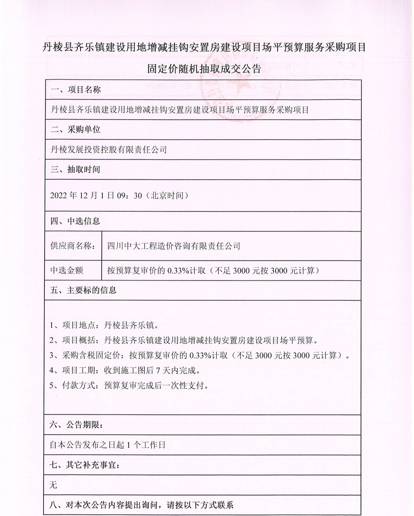 丹棱縣齊樂鎮(zhèn)建設(shè)用地增減掛鉤安置房建設(shè)項目場平預(yù)算服務(wù)采購項目固定價隨機抽取成交公告