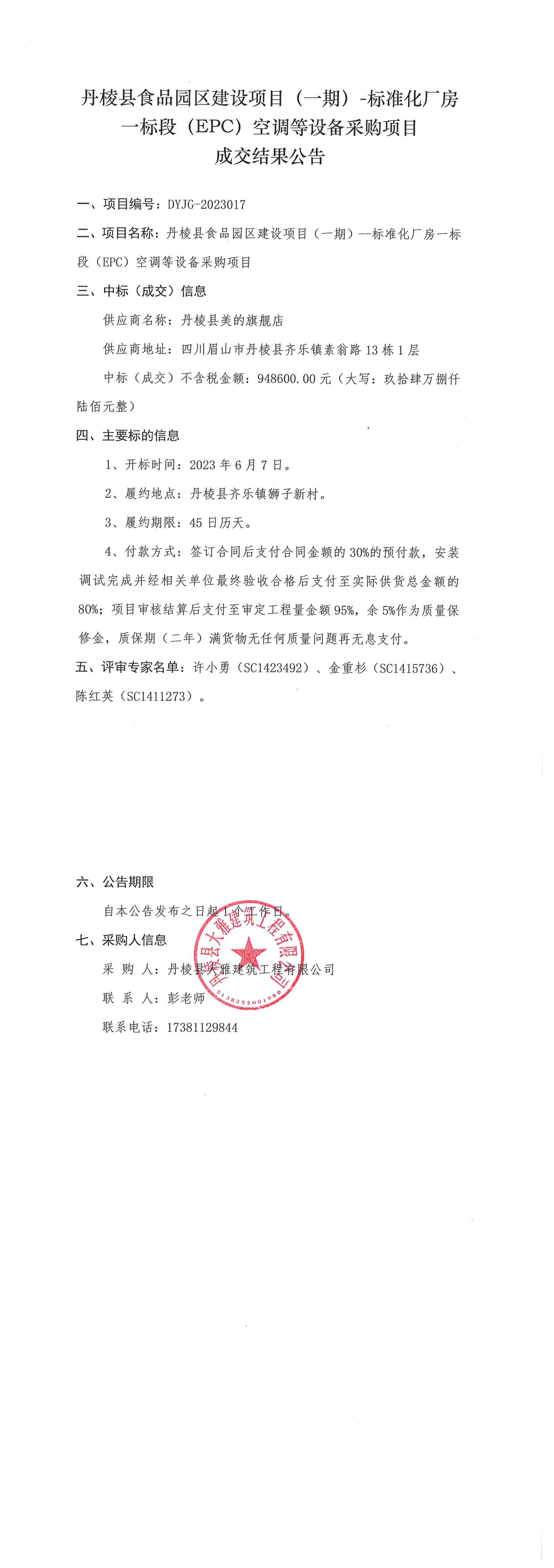 丹棱縣食品園區(qū)建設(shè)項目(一期)-標(biāo)準(zhǔn)化廠房一標(biāo)段(EPC)空調(diào)等設(shè)備采購項目成交結(jié)果公告