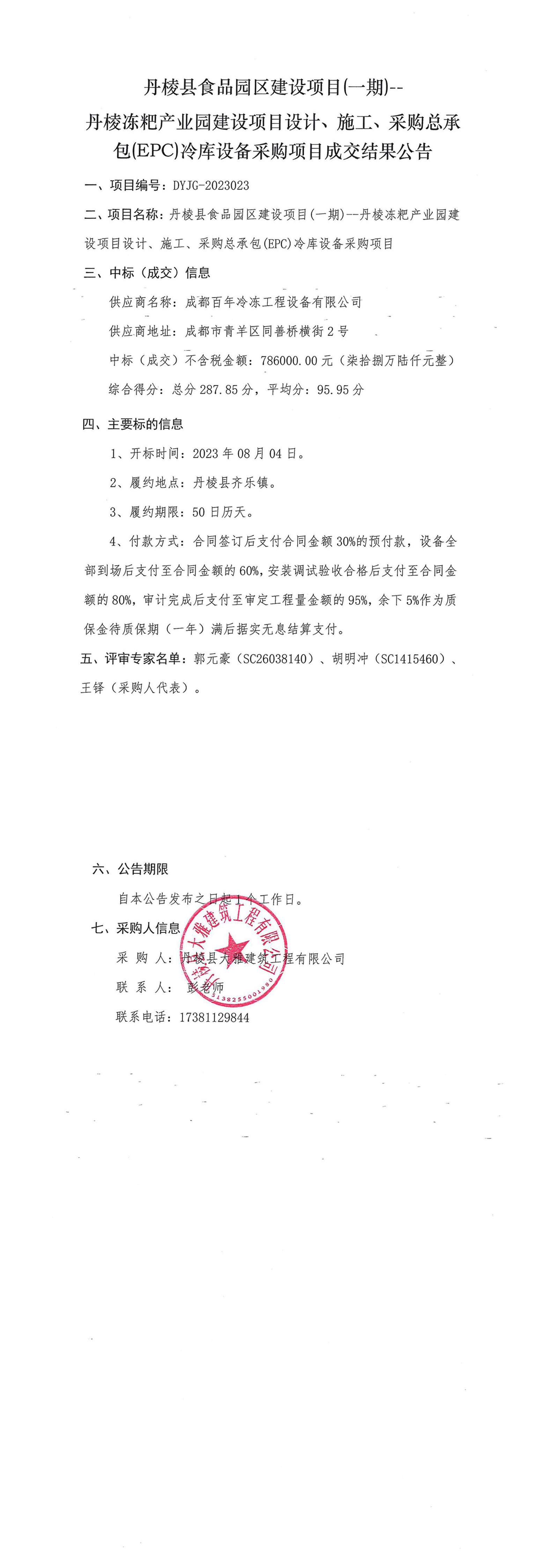 丹棱縣食品園區(qū)建設項目(一期)--丹棱凍粑產業(yè)園建設項目設計、施工、采購總承包(EPC)冷庫設備采購項目成交結果公告