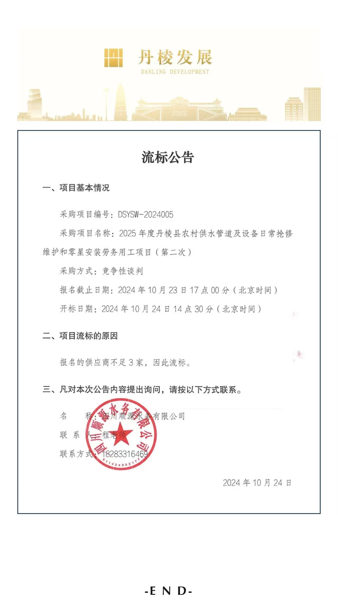2025年度丹棱縣農(nóng)村供水管道及設(shè)備日常搶修維護(hù)和零星安裝勞務(wù)用工項目(第二次)流標(biāo)公告