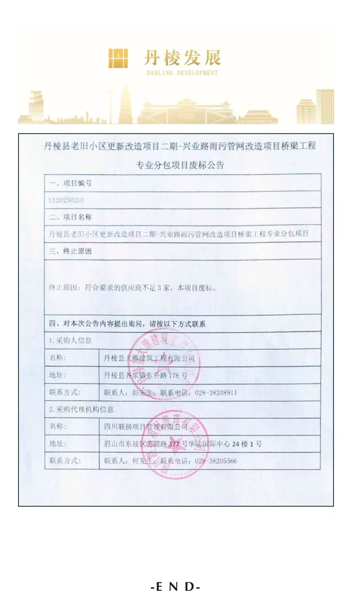 丹棱縣老舊小區(qū)更新改造項(xiàng)目二期-興業(yè)路雨污管網(wǎng)改造項(xiàng)目橋梁工程專業(yè)分包項(xiàng)目廢標(biāo)公告