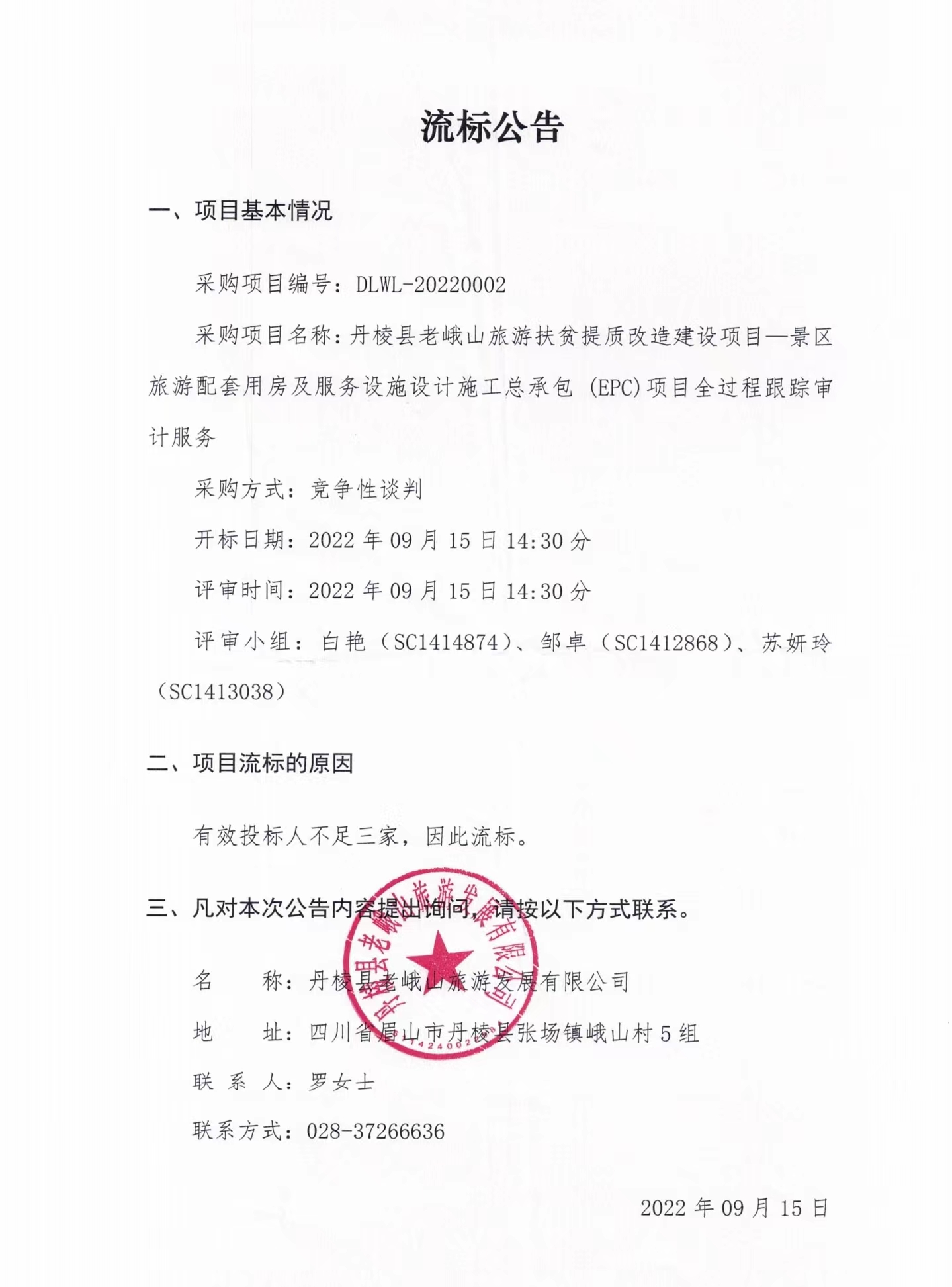 丹棱縣老峨山旅游扶貧提質(zhì)改造建設(shè)項(xiàng)目--景區(qū)旅游配套用房及服務(wù)設(shè)施設(shè)計(jì)施工總承包(EPC)項(xiàng)目全過程跟蹤審計(jì)服務(wù)流標(biāo)公告