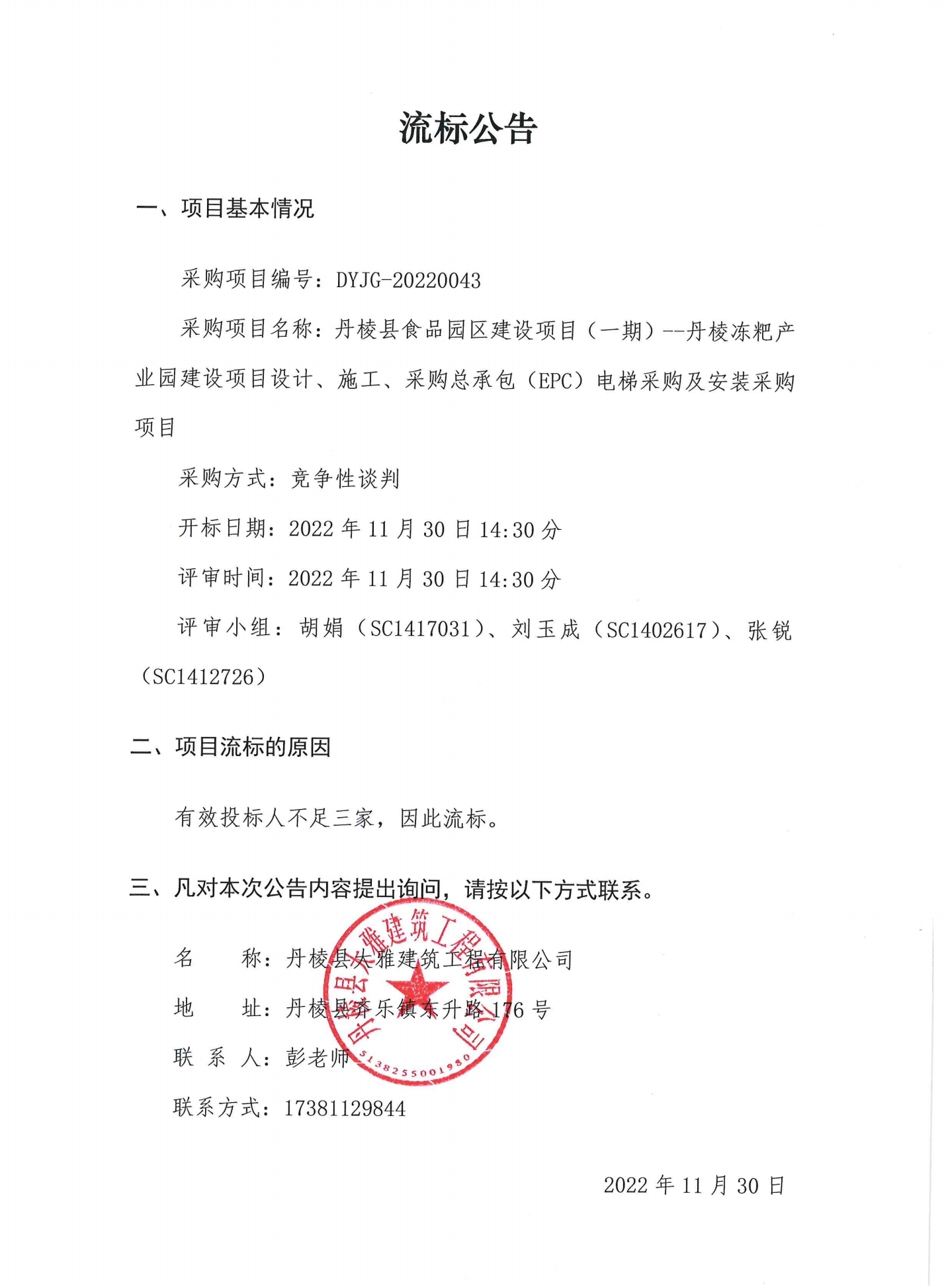 丹棱縣食品園區(qū)建設(shè)項目 (一期)--丹棱凍粑產(chǎn)業(yè)園建設(shè)項目設(shè)計、施工、采購總承包 (EPC) 電梯采購及安裝采購項目流標(biāo)公告