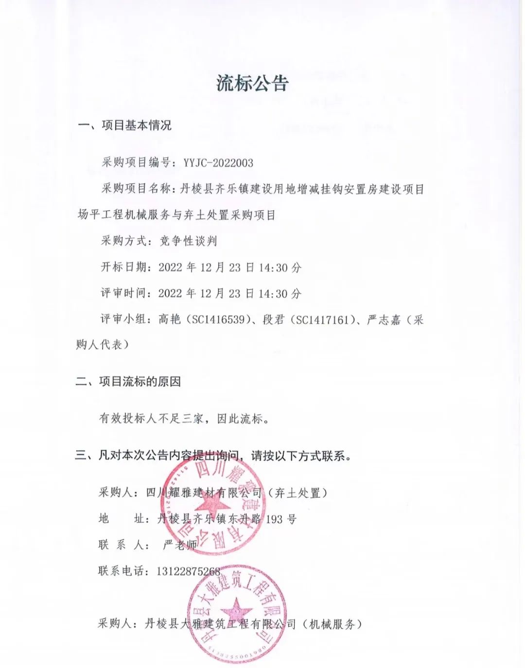丹棱縣齊樂鎮(zhèn)建設用地增減掛鉤安置房建設項目場平工程機械服務與棄土處置采購項目流標公告
