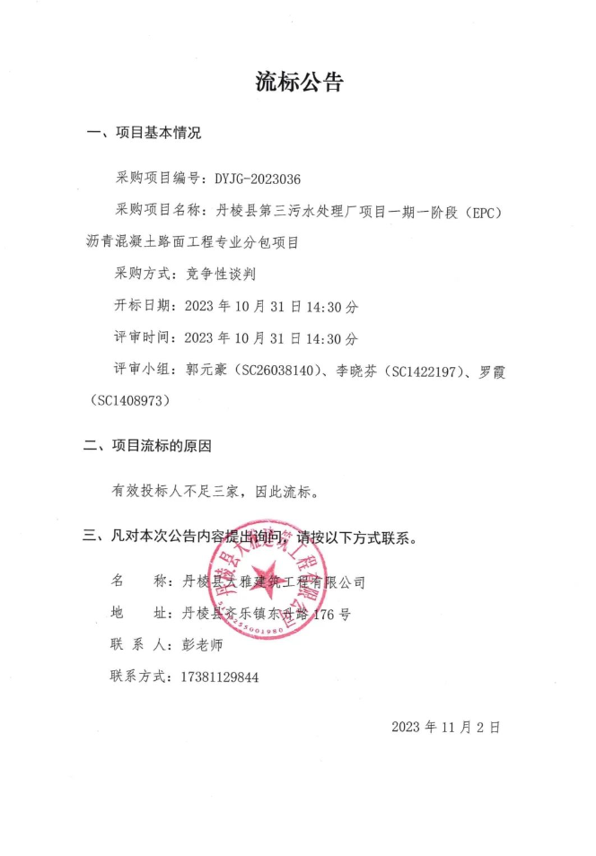 丹棱縣第三污水處理廠項(xiàng)目一期一階段(EPC)瀝青混凝土路面工程專(zhuān)業(yè)分包項(xiàng)目流標(biāo)公告