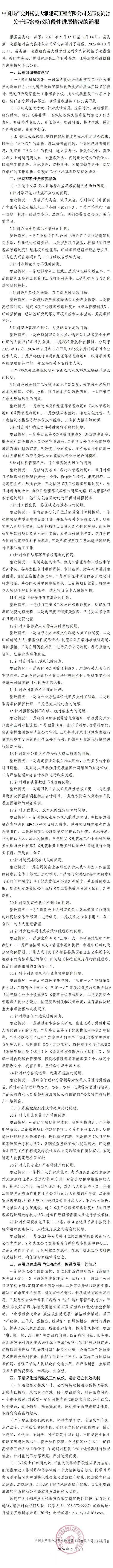 中國共產(chǎn)黨丹棱縣大雅建筑工程有限公司支部委員會關(guān)于巡察整改階段性進展情況的通報