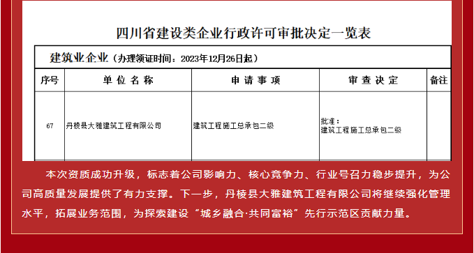 【縣大雅建筑公司】喜報!成功升級“建筑工程施工總承包二級”資質!
